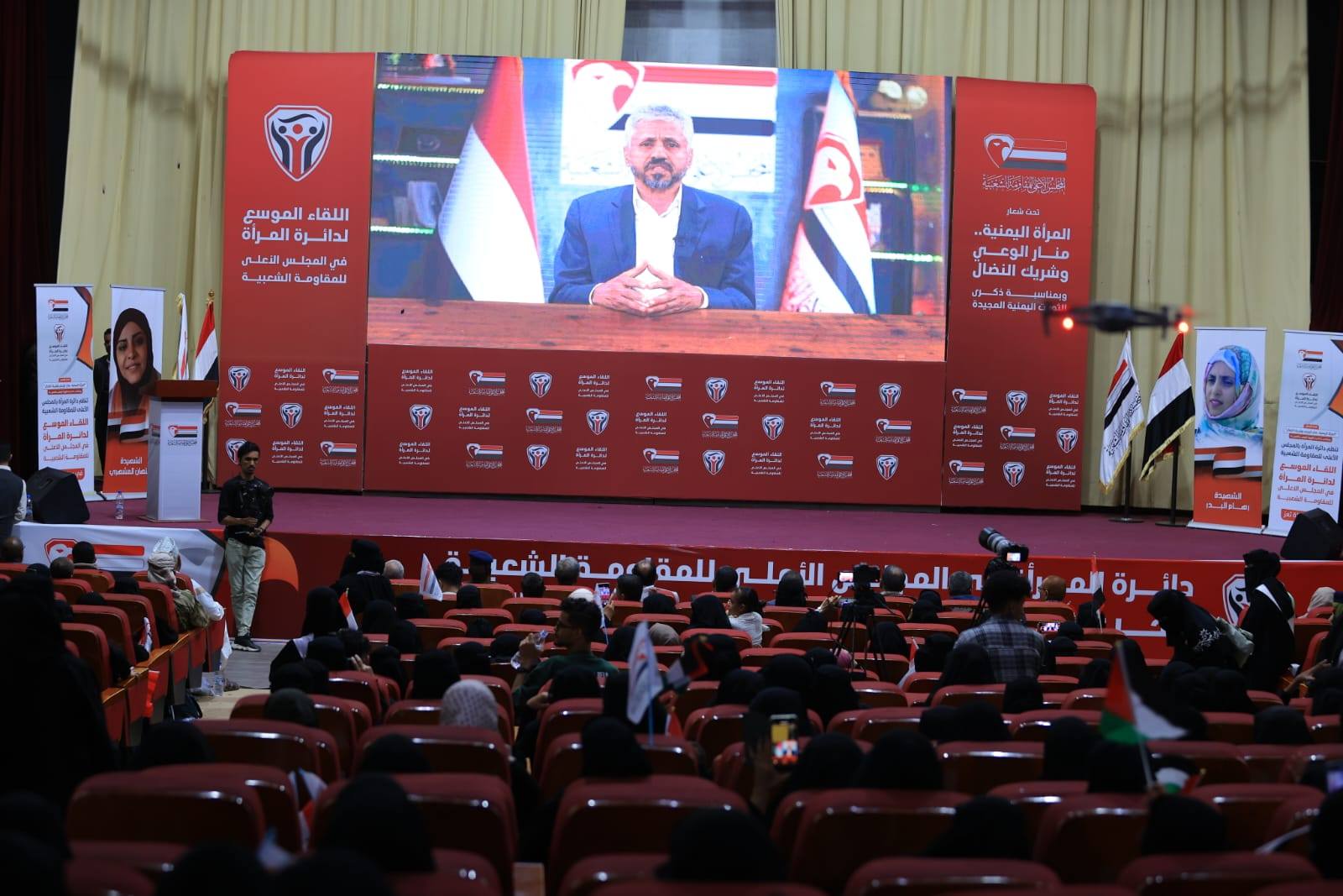 In his speech via video conference, Sheikh Hamoud Saeed Al-Mikhlafi, head of the Supreme Council of the Popular Resistance, said that women in Taiz have played heroic roles during the years of confrontation with the Houthi militia, by supporting fighters, maintaining the cohesion of the internal front, and engaging in military and security training and rehabilitation. He emphasized his belief in the ability of women in Taiz Governorate to contribute to improving the general situation and overcoming exceptional challenges.