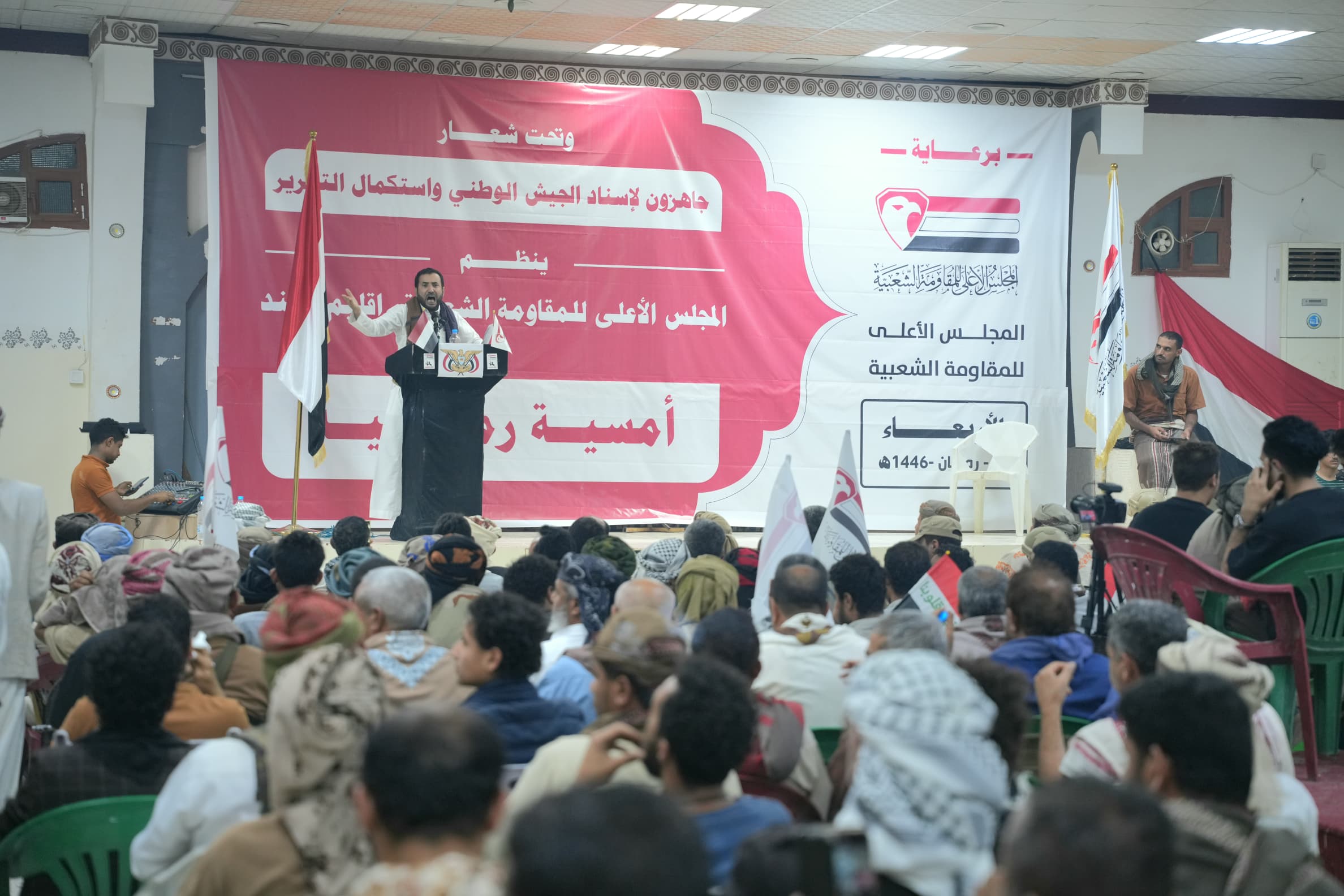 Evening there, Abdulrahman Al-Mahjari, a member of the Taiz Resistance Council, said, "We are gathering at this major meeting to renew our firm and strong supportive stance for the sacred national battle to restore the state and end the Houthi priestly project funded by the terrorist Iranian regime."