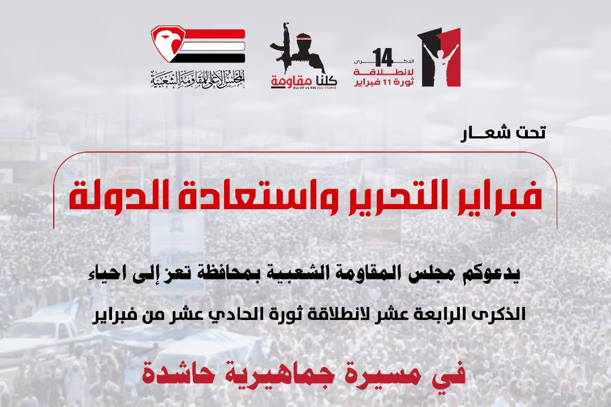 The Popular Resistance Council in Taiz Governorate called for a large mass gathering to commemorate the fourteenth anniversary of the launch of the February 11 Revolution, under the slogan "February Liberation and Restoration of the State."