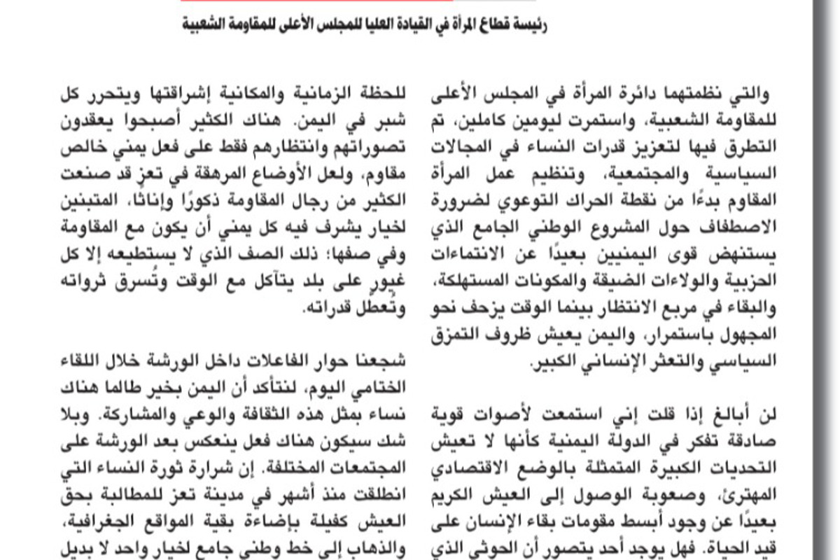 We encouraged the dialogue of the female activists within the workshop during today's closing meeting, to confirm that Yemen is well as long as there are women with such culture, awareness, and participation. Undoubtedly, there will be action that will be reflected in various communities after the workshop. The spark of the women's revolution that erupted months ago in the city of Taiz to demand the right to live is sufficient to illuminate other geographical locations and move towards a unified national path with one unavoidable option: the liberation of the nation as a whole. What this workshop brings to mind is that it is capable of creating a different mood for resistance action and encouraging the souls that have withered from waiting for liberation to work again in a more hopeful way, more prepared to reclaim the republic and build the state. Every Yemeni, in our view, has reached the complete conviction that Yemen will only be liberated by its own people, and this is what we can only count on.